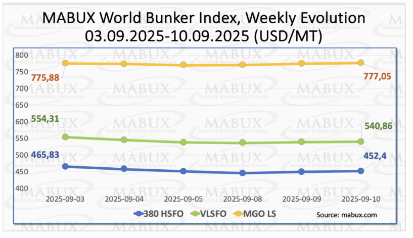 在第37周结束时,全球燃料仓指数MABUX呈现混合动态,总体趋势不明显。380恒生指数下跌13.43美元,至452.40美元/吨,再次逼近450美元关口。