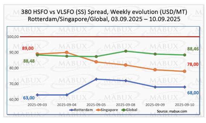 MABUX全球洗涤器价差(SS) - 380 HSFO和vlsfo之间的价差-在一周内几乎保持不变,从88.48美元小幅下跌0.02美元至88.46美元,并继续稳定保持在100美元的心理盈利率关口以下。