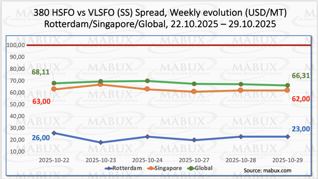 MABUX全球洗涤器价差(SS) - 380 HSFO和VLSFO之间的价差-继续收窄,下降了1.80美元(从上周的68.11美元降至66.31美元),并始终低于100美元的心理门槛(SS盈亏平衡水平)。
