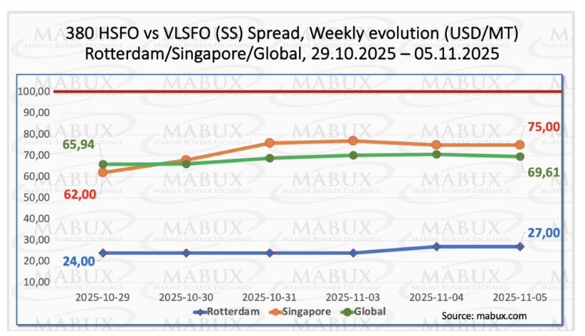 MABUX全球洗涤器价差(SS)——380 HSFO和VLSFO之间的价差——从上周的65.94美元小幅上涨至69.61美元,涨幅为3.67美元。该指标目前正在接近70.00美元的水平,但仍稳定在100美元的SS盈亏平衡点以下。
