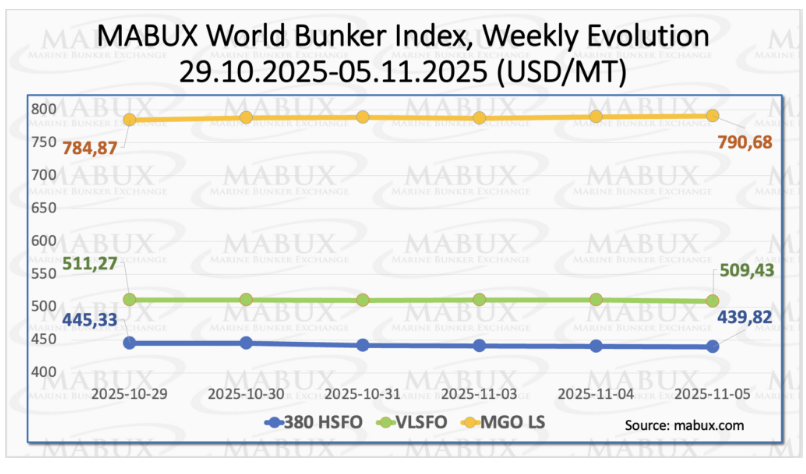 在第45周结束时,MABUX市场差异指数(MDI)——代表市场燃油价格(MBP)和MABUX数字燃油基准(DBP)之间的比率——反映了鹿特丹、新加坡、富查伊拉和休斯顿等全球主要枢纽的以下燃油价格趋势: