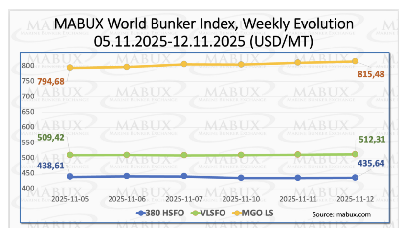 根据MABUX的数据,在第46周结束时,全球燃料市场继续呈现出主要燃料等级的混合动态。380 HSFO指数下跌2.97美元,跌至435.64美元/公吨。