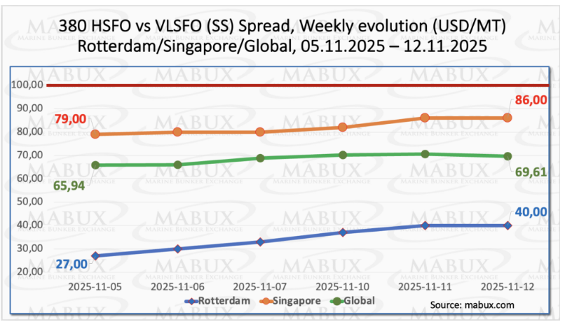 该指数的周平均值也增加了4.39美元。在鹿特丹,SS价差也继续上升,增加了13.00美元(40.00美元/吨),形成了稳定的上升趋势。该港口的每周平均SS价差增加了9.50美元。在新加坡,380 HSFO和VLSFO之间的价差扩大了7美元,达到86.00美元/吨,超过了80.00美元大关。