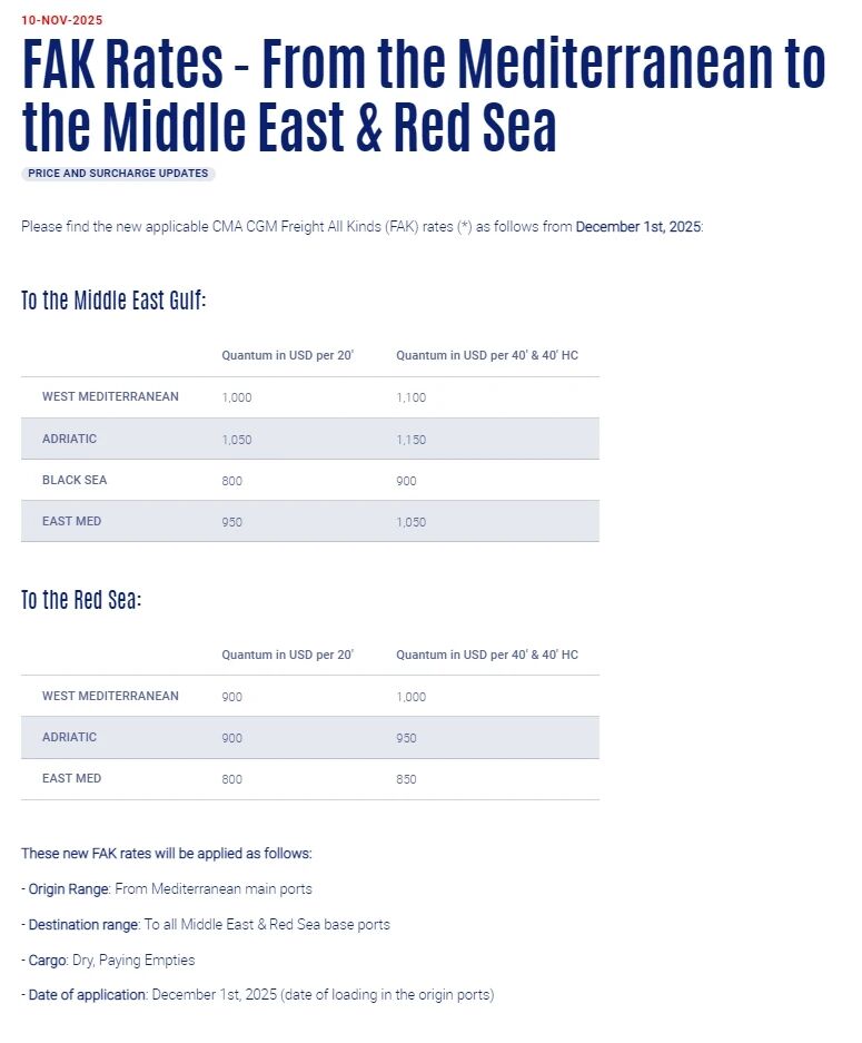 达飞轮船宣布,自2025年12月1日(以始发港装货日为准),启用地中海至中东及红海地区的新各类货物统一运费(FAK)费率。
