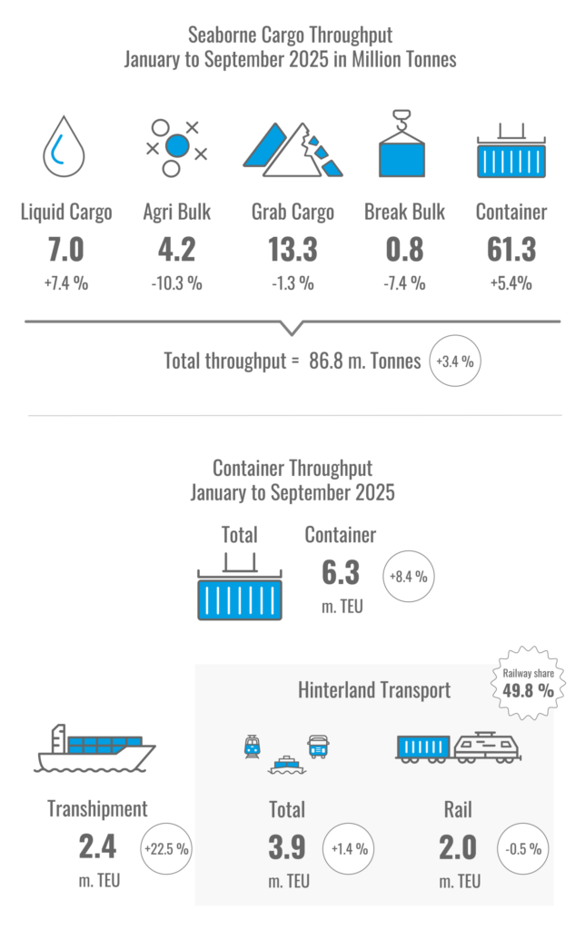 2025年1月至9月,海运货物吞吐量同比增长3.4%,达到8680万吨。集装箱吞吐量增长8.4%,达到630万标准箱,相当于6130万吨集装箱货物(增长5.4%)。散货量基本稳定在2460万吨(-0.8%)。抓斗货物增长强劲(+9.4%),其中煤炭(+16.4%)和矿石进口(+3.8%)领涨。