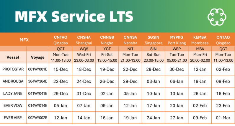 据了解,新推出的MFX航线首班航次(PROTOSTAR/2551W)已确定于12月16日从青岛始发。MFX航线全程港序为:青岛→上海→宁波→南沙→新加坡→巴生→蒙巴萨→青岛。