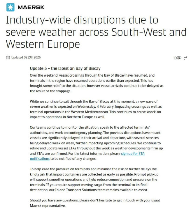 受持续冰雪天气和极寒气温影响,欧洲从北欧至西南欧的物流命脉近乎中断。马士基(Maersk)与达飞轮船(CMA CGM)已于1月28、29日连续发布预警: